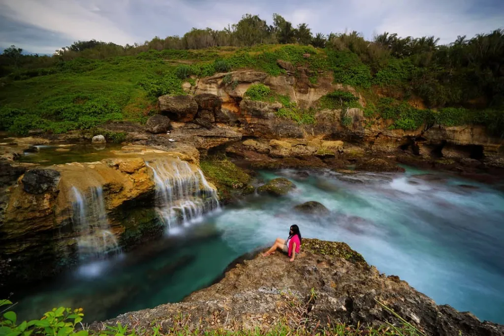Begitu sampai di lokasi, keindahan alamnya langsung memanjakan mata. Tebing-tebing batu yang menjulang menjadi latar air terjun kecil yang jatuh langsung ke laut lepas. Suara deburan ombak berpadu dengan gemericik air membuat suasana semakin menenangkan.