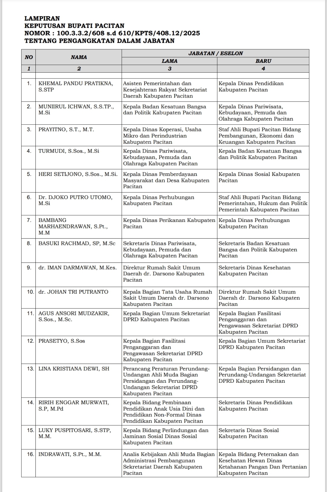BeritaIDN, PACITAN-Bupati Pacitan, Indrata Nur Bayuaji, resmi melantik 79 pejabat lingkup Pemkab. Pacitan. Namun, beberapa posisi strategis diketahui masih belum terisi dan akan menunggu proses tahap II, yang direncanakan awal tahun 2026.