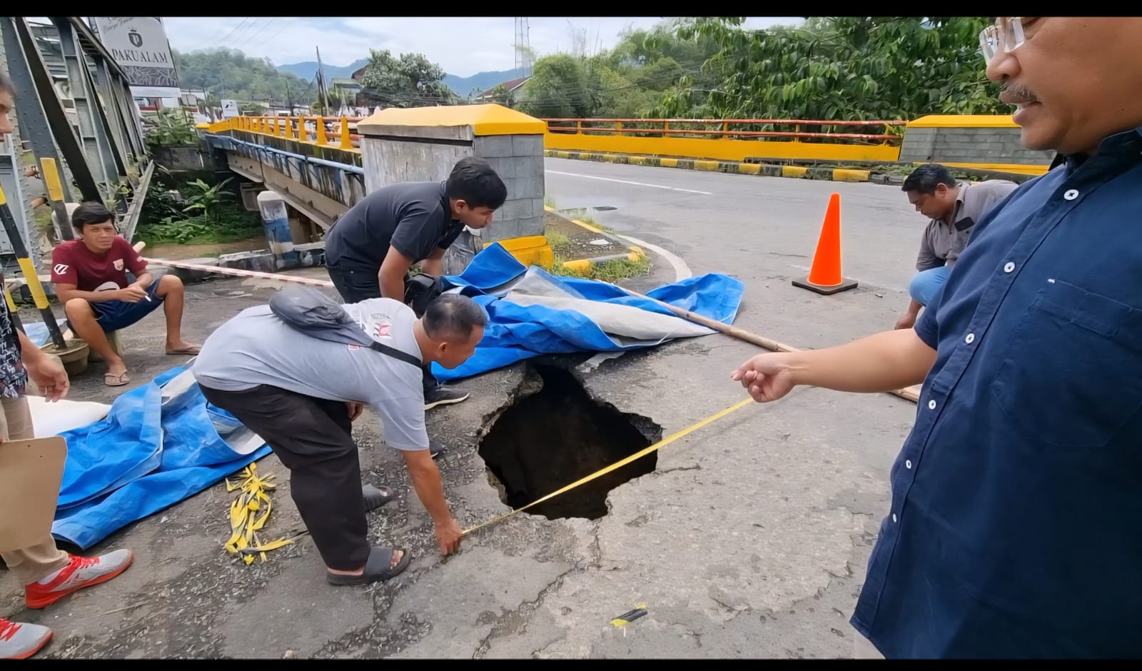 “Kejadian ini akibat banjir sungai di Arjosari yang melintasi jembatan. Air menggerus pondasi sehingga terjadi lubang dan menarik urukan di line hop jembatan. Akibatnya, aspal di bagian atas ambles,” ujar Budi, Senin (16/2/2026).